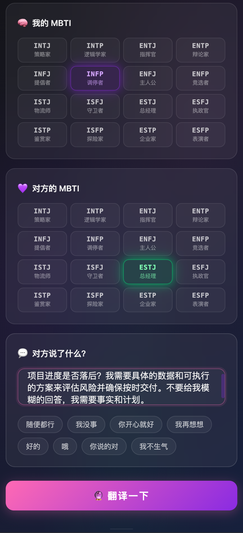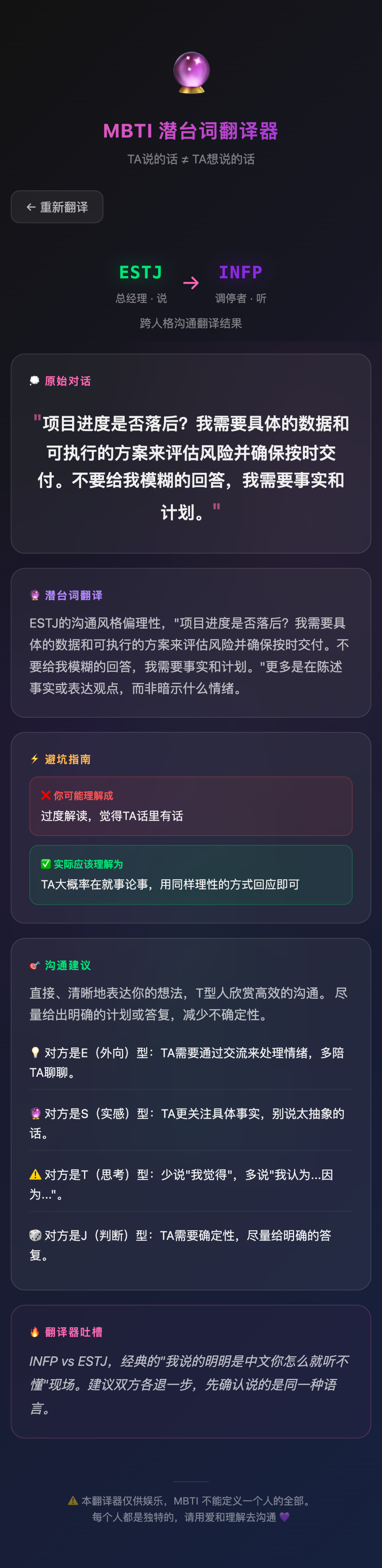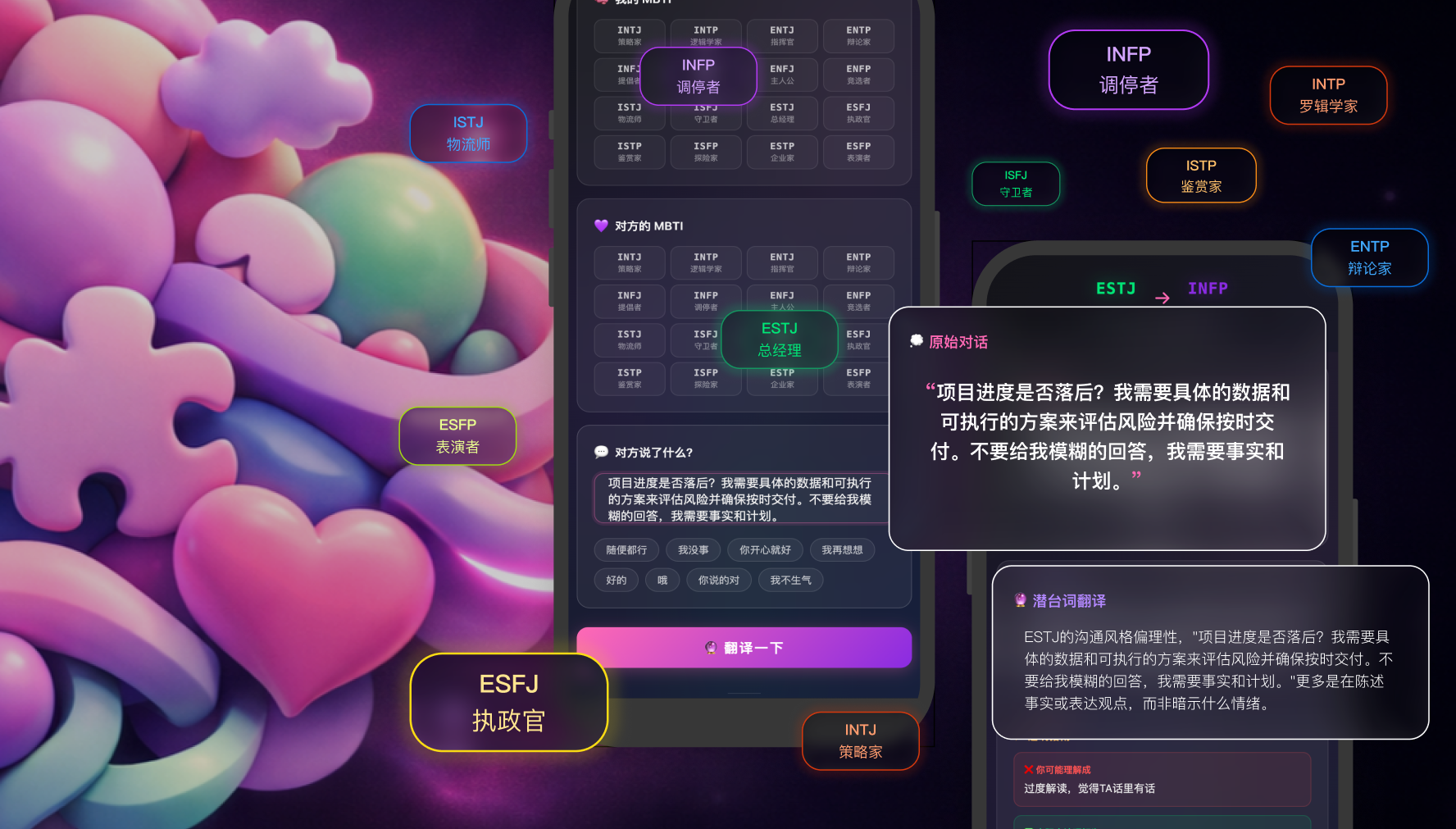 学习动机: 在一次因为没听懂领导“潜台词”而导致项目延期后,小林深感沟通成本之高。他意识到,如果能有一个工具,将不同 MBTI 的表达方式进行“解码”,或许能拯救像他一样的职场小白。